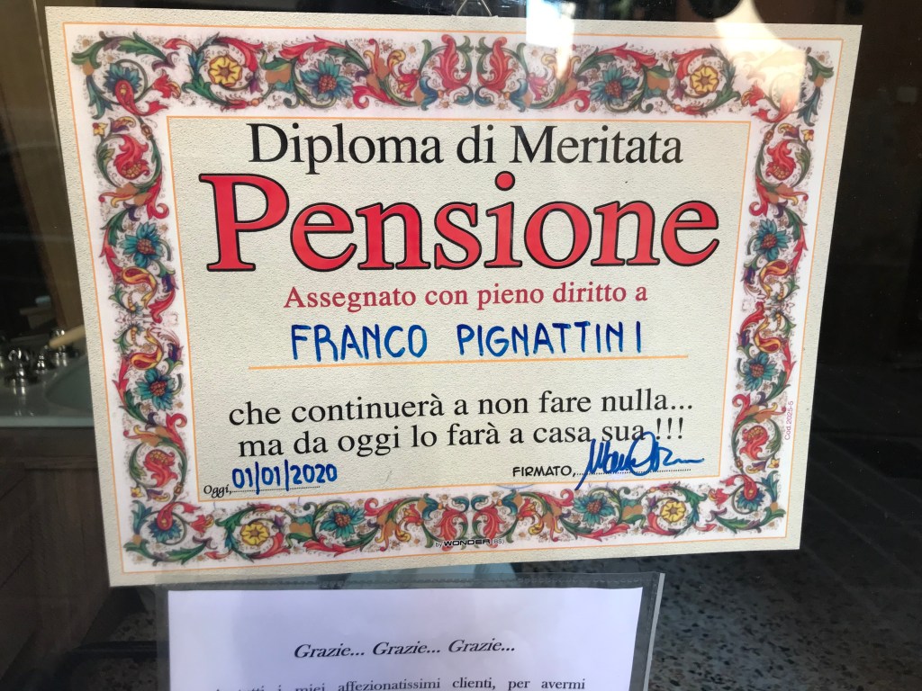 A couple of days later, I had to go into town. And I didn’t realize what a big deal it was. Franco’s shop was closed, but there was a retirement certificate of sorts in the window: “Diploma of Deserved Retirement. Given with full rights to Franco P, who will continue to do nothing…but from today he’ll be doing it at home.” A notice below, which was posted for a stretch on the street as well, invited the neighborhood to his party at the local social center, conveniently located across the street from our place. Well, convenient except when ’70s music fans have an end of term party and blast Led Zeppelin at 2 in the morning, but it’s all part of the experience.