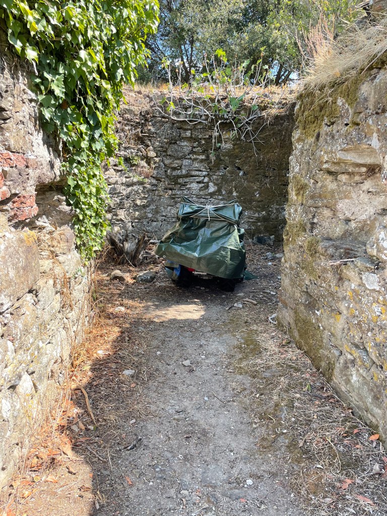 Great place—the ruins of an ancient mill—to store a motorcycle, no?