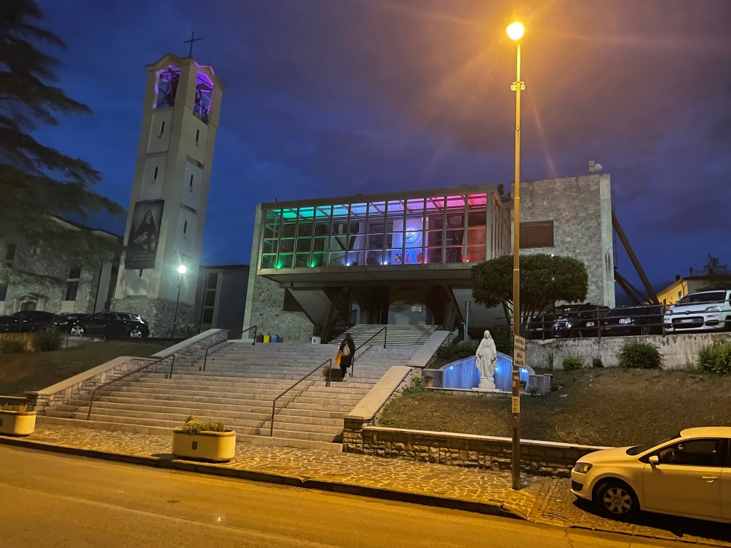 We walked around town after dinner at the “taverna”—when towns set up outdoor restaurants for celebrations. The iPhone’s night mode always makes the mundane look interesting, even if I have to admit that our cantilevered town hall is pretty interesting by itself.