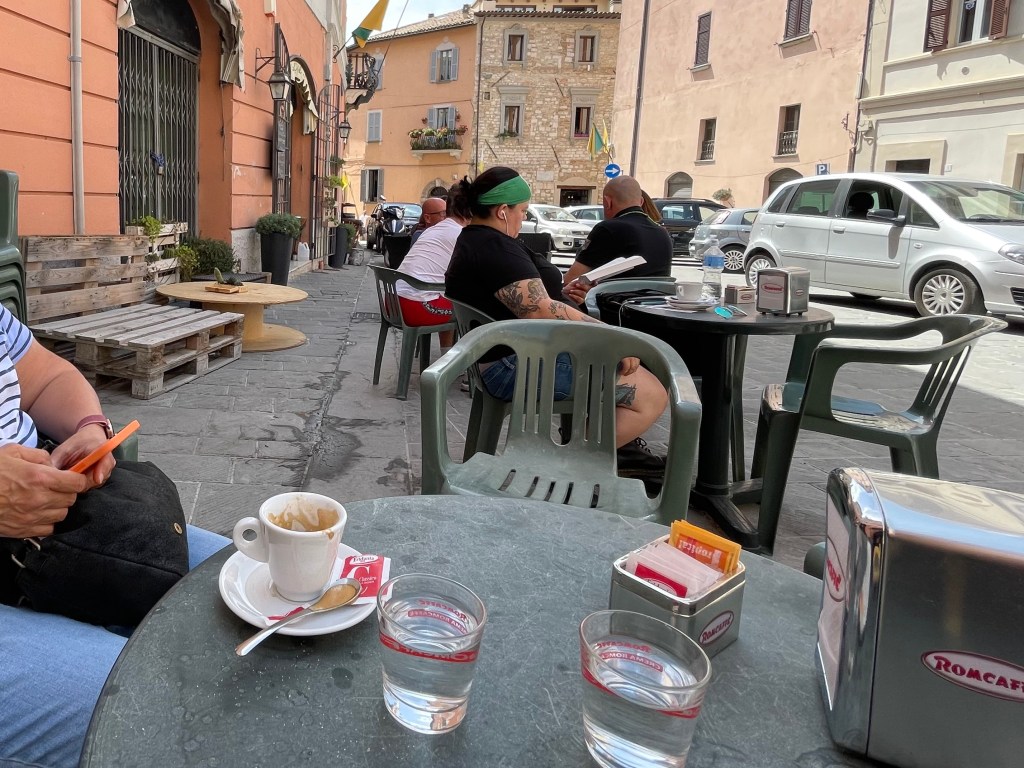 If the container was new, the filling was as it always was. The Taverna still trades in slightly creative, upscale versions of local dishes with “km 0” (farm-to-table) ingredients, and we were happy to indulge in a plate of local pecorino cheeses, including one that resembled Brie. The Spartan Woman went real roots and had lentil soup, while I happily indulged in the local pasta, stringozzi, showered with tons of local truffles. She had the truffles atop her trout, while I went off our usual meat-free diet because I had this weird craving for Umbrian sausages. We had some sauteed wild greens, almost like spinach to go with it, and a small pitcher of local wine.