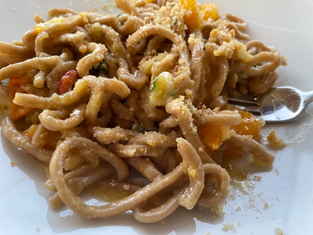 Food porn alert: We had a shared appetizer of a fritto misto, crisp fried vegetables, fried mozzarella balls, and the local delicacy, olive all’Ascolana. These last had a little chopmeat in them; I made the sacrifice and scarfed them up. TSW followed with orecchiette with pesto; I had the local specialty called pincinelle, simply dressed with olive oil, garlic, chilis, and bread crumbs. The pincinelle resemble the Tuscan pici, or Umbrian umbricelle, in being thick homemade long pasta with a chewy texture. But these are made of stoneground whole wheat and, unusual for pasta, yeast. Historically, pincinelle were made from some set-aside bread dough.