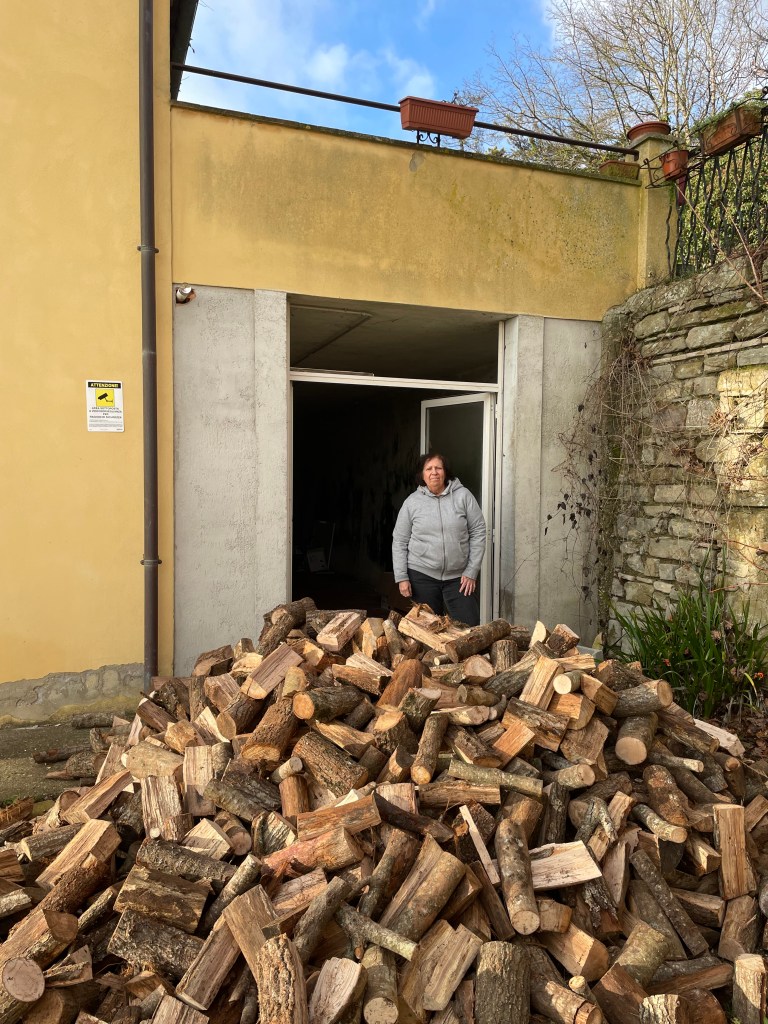 He was good at his word. This morning a little dump truck arrived and tipped almost 19 quintali—that’s 1800+ kilograms or nearly 4,000 pounds of the stuff near our garage door. It was not a little pile, nor was it all stacked in a pretty box. If it were packaged nicely, it would have cost a lot more than €340, which is a fraction of what propane would’ve cost us to heat the house for the same period. TSW, with her superior logistical skills, designated areas for big pieces, kindling, and in-between annoying pieces, and we went to work. I must confess that she did more; a bad back, the result of my Summer of Coughing, made me take breaks after every dozen of chunks of wood stacked.